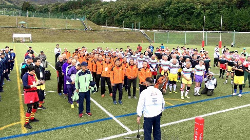 | 2025/10/19 ねんりんピック岐阜2025ラグビー交流大会が開幕 10月19日(日)郡上市高鷲叺高原スポーツ広場にて、第37回全国健康福祉祭ぎふ大会「ねんりんピック岐阜2025ラグビーフットボール交流大会」が、全国から31チーム・689名の60歳以上の選手・関係者が参加して開幕しました。開会式では岐阜惑惑クラブの竹村直士選手(89歳)が大会参加高齢者賞を受賞され力強く選手宣誓を行ない拍手喝采でした。大会は明日20日まで計32試合が行われ、往年の技と不屈のラグビー魂がぶつかりあいます。皆さまにはくれぐれもケガなくラグビーを楽しんで頂きますよう祈念いたします。   |